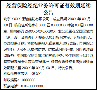 北京XXXX保險經(jīng)紀(jì)有限公司,成立日期20XX年XX月XX日,機構(gòu)住所北京市XXX區(qū)XXXXXXX幢第XX層XXXX室,機構(gòu)編碼260XX6XX0XX8XX,業(yè)務(wù)范圍在全國區(qū)域內(nèi)(港、澳、臺除外)為投保人擬訂投保方案、選擇保險人、辦理投保手續(xù);協(xié)助被保險人或受益人進行索賠;再保險經(jīng)紀(jì)業(yè)務(wù);為委托人提供防災(zāi)、防損或風(fēng)險評估、風(fēng)險管理咨詢服務(wù);中國銀保監(jiān)會批準(zhǔn)的其他業(yè)務(wù),經(jīng)中國銀行保險監(jiān)督管理委員會北京監(jiān)管局批準(zhǔn),經(jīng)營保險經(jīng)紀(jì)業(yè)務(wù)許可證有效期延長至20XX年XX月XX日,特此公告。