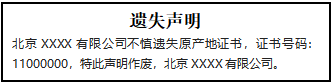 北京XXXX有限公司不慎遺失原產(chǎn)地證書,證書號碼:11000000,特此聲明作廢,北京XXXX有限公司。