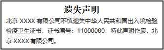 北京XXXX有限公司不慎遺失中華人民共和國出入境檢驗檢疫衛(wèi)生證書,證書編號:11000000,特此聲明作廢,北京XXXX有限公司。