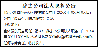 全體股東同意現(xiàn)任“張XX”辭去本公司法人職務,自20XX年XX月XX日起不承擔北京XX國際融資租賃有限公司的任何法律責任,特此公告。