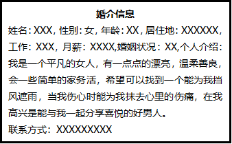 姓名:XXX,性別:女,年齡:XX,居住地:XXXXXX,工作:XXX,月薪:XXXX,婚姻狀況:XX,個人介紹:我是一個平凡的女人,有一點(diǎn)點(diǎn)的漂亮,溫柔善良,會一些簡單的家務(wù)活,希望可以找到一個能為我擋風(fēng)遮雨,當(dāng)我傷心時能為我抹去心里的傷痛,在我高興是能與我一起分享喜悅的好男人。