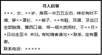 ×××,女,××歲,身高一米五五左右,神志有時不清,穿××罩衫,××褲子,××布鞋,耳聾,牙齒已全部脫落,豫西口音,帶一根木質(zhì)拐杖,于××月××日出走至今 未歸。有知情者請與××聯(lián)系,定有重謝。