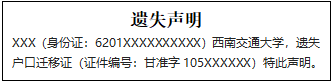 XXX(身份證:6201XXXXXXXXXX)西南交通大學(xué),遺失戶口遷移證(證件編號:甘準字105XXXXXX)特此聲明。