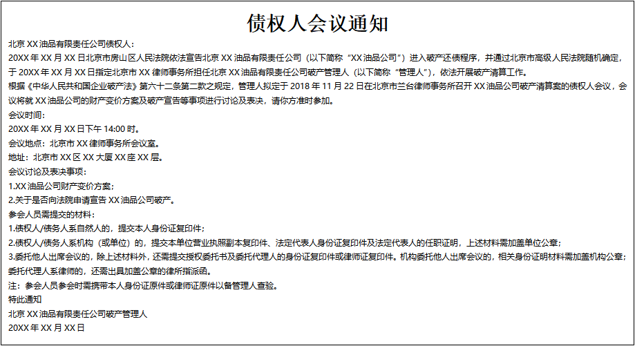 根據《中華人民共和國企業(yè)破產法》第六十二條第二款之規(guī)定,管理人擬定于2018年11月22日在北京市蘭臺律師事務所召開XX油品公司破產清算案的債權人會議,會議將就XX油品公司的財產變價方案及破產宣告等事項進行討論及表決,請你方準時參加。