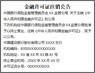 中國銀行保險(xiǎn)監(jiān)督管理委員會(huì)XX監(jiān)管分局 關(guān)于注銷《中華人民共和國金融許可證》的公告