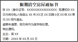 張XX(身份證號:XXXXXXXXXXXXXXXX)現(xiàn)通知你XX日內(nèi)將你私人物品從XX市XX區(qū)XX花園小區(qū)XX棟XX單元XX間內(nèi)清走。