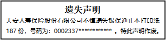 天安人壽保險(xiǎn)股份有限公司不慎遺失銀保通正本打印紙187份,號(hào)碼為:0002337************ 。特此聲明作廢。