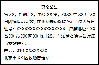 曾XX,性別:X,年齡XX歲,20XX年XX月XX日因病醫(yī)治無效,在我站定點醫(yī)院死亡。該人身份證號:XXXXXXXXXXXXXXXXXX,戶籍地址:XX省XX市XX區(qū)XX棟128。有知情者請轉(zhuǎn)告家屬與我站聯(lián)系。