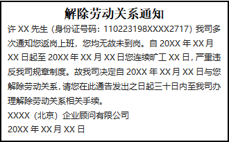 許XX先生(身份證號(hào)碼:110223198XXXX2717)我司多次通知您返崗上班,您均無(wú)故未到崗。自20XX年XX月XX日起至20XX年XX月XX日您連續(xù)曠工XX日,嚴(yán)重違反我司規(guī)章制度。故我司決定自20XX年XX月XX日與您解除勞動(dòng)關(guān)系,請(qǐng)您在此通告發(fā)出之日起三十日內(nèi)至我司辦理解除勞動(dòng)關(guān)系相關(guān)手續(xù)。