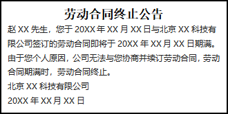 趙XX先生,您于20XX年XX月XX日與北京XX科技有限公司簽訂的勞動合同即將于20XX年XX月XX日期滿。由于您個(gè)人原因,公司無法與您協(xié)商并續(xù)訂勞動合同,勞動合同期滿時(shí),勞動合同終止。