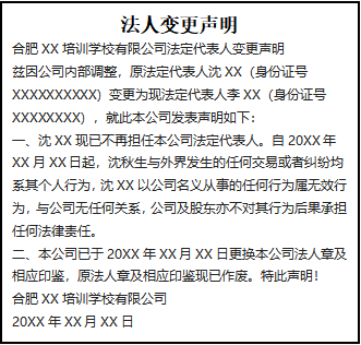 合肥XX培訓(xùn)學(xué)校有限公司法定代表人變更聲明