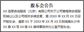XX信息咨詢服務(wù)(北京)有限公司關(guān)于公司章程修改或股權(quán)轉(zhuǎn)讓以及公司相關(guān)手續(xù)變更,需20XX年XX月XX日召開股東會,請郭XX于20XX年XX月XX日到湖南長沙市XX路XX號XX樓XX律師事務(wù)所辦公室開股東會。