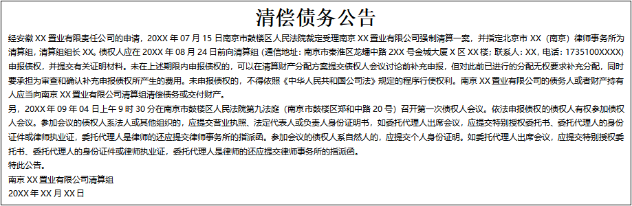經(jīng)安徽XX置業(yè)有限責任公司的申請,20XX年07月15日南京市鼓樓區(qū)人民法院裁定受理南京XX置業(yè)有限公司強制清算一案,并指定北京市XX(南京)律師事務(wù)所為清算組,清算組組長XX。債權(quán)人應(yīng)在20XX年XX月XX日前向清算組(通信地址:南京市秦淮區(qū)龍蟠中路2XX號金城大廈X區(qū)XX樓;聯(lián)系人:XX,電話:1735100XXXX)申報債權(quán),并提交有關(guān)證明材料。未在上述期限內(nèi)申報債權(quán)的,可以在清算財產(chǎn)分配方案提交債權(quán)人會議討論前補充申報,但對此前已進行的分配無權(quán)要求補充分配,同時要承擔為審查和確認補充申報債權(quán)所產(chǎn)生的費用。未申報債權(quán)的,不得依照《中華人民共和國公司法》規(guī)定的程序行使權(quán)利。南京XX置業(yè)有限公司的債務(wù)人或者財產(chǎn)持有人應(yīng)當向南京XX置業(yè)有限公司清算組清償債務(wù)或交付財產(chǎn)。