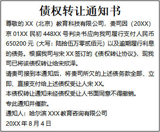 尊敬的XX(北京)教育科技有限公司,貴司因(20XX)京01XX民初448XX號(hào)判決書(shū)應(yīng)向我司履行支付人民幣650200元(大寫(xiě):陸拾伍萬(wàn)零貳佰元)以及逾期履行利息的債務(wù)。根據(jù)我司與宋XX簽訂的《債權(quán)轉(zhuǎn)讓協(xié)議》,現(xiàn)我司已將該債權(quán)轉(zhuǎn)讓給宋欣澤。