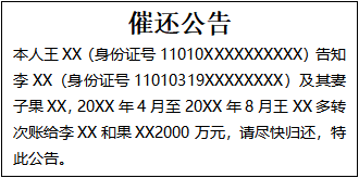 本人王XX(身份證號(hào)11010XXXXXXXXXX)告知李XX(身份證號(hào)11010319XXXXXXXX)及其妻子果XX,20XX年4月至20XX年8月王XX多轉(zhuǎn)次賬給李XX和果XX2000萬(wàn)元,請(qǐng)盡快歸還,特此公告。