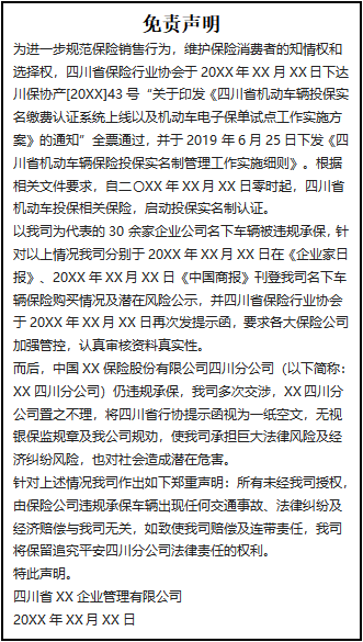 針對(duì)上述情況我司作出如下鄭重聲明:所有未經(jīng)我司授權(quán),由保險(xiǎn)公司違規(guī)承保車(chē)輛出現(xiàn)任何交通事故、法律糾紛及經(jīng)濟(jì)賠償與我司無(wú)關(guān),如致使我司賠償及連帶責(zé)任,我司將保留追究平安四川分公司法律責(zé)任的權(quán)利。