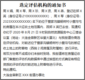 周X娟、周X琴、周X珍、周X賢、周X燕,登記在鄭X英(身份證號(hào):210XXXXXXXXXX)、周X琴(身份證號(hào):2323XXXXXXXXXX)名下的位于董家溝鎮(zhèn)楊樹村小董溝屯的房屋在本次征收土地范圍內(nèi),因鄭X英已去世,現(xiàn)通知你們于2020年8月21日9時(shí)到自然資源服務(wù)中心三樓會(huì)議室(地址:大連金普新區(qū)華堂大廈北)與我街道協(xié)商選定評(píng)估機(jī)構(gòu),對(duì)前述位于董家溝鎮(zhèn)楊樹村小董溝屯的被征收土地上的附著物(西側(cè)2間房屋及附屬物)進(jìn)行評(píng)估。