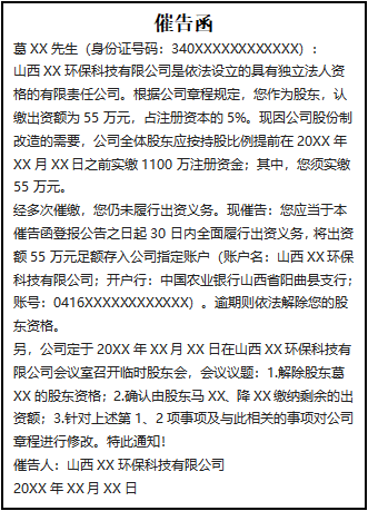 經(jīng)多次催繳,您仍未履行出資義務(wù)。現(xiàn)催告:您應(yīng)當(dāng)于本催告函登報(bào)公告之日起30日內(nèi)全面履行出資義務(wù),將出資額55萬(wàn)元足額存入公司指定賬戶(賬戶名:山西XX環(huán)?萍加邢薰;開戶行:中國(guó)農(nóng)業(yè)銀行山西省陽(yáng)曲縣支行;賬號(hào):0416XXXXXXXXXXXX)。逾期則依法解除您的股東資格。
