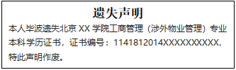 本人畢波遺失北京XX學(xué)院工商管理(涉外物業(yè)管理)專業(yè)本科學(xué)歷證書,證書編號(hào):1141812014XXXXXXXXXX,特此聲明作廢。