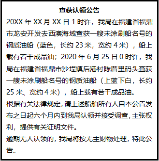 根據(jù)有關(guān)法律規(guī)定,請(qǐng)上述船舶所有人自本公告發(fā)布之日起六個(gè)月內(nèi)到我局認(rèn)領(lǐng)并接受調(diào)查,主張權(quán)利,提供有關(guān)證明文件。