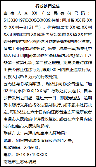 因無(wú)法與你取得聯(lián)系,現(xiàn)依法向你公告送達(dá)“通02環(huán)罰字[20XX]1XX號(hào)”行政處罰決定書,自本公告發(fā)出之日起,經(jīng)過(guò)六十日,即視為送達(dá),逾期仍未履行義務(wù)的將依法強(qiáng)制執(zhí)行。如不服本處罰決定,可以依法在六十日內(nèi)向江蘇省生態(tài)環(huán)境廳或者南通市人民政府申請(qǐng)行政復(fù)議,或者在六個(gè)月內(nèi)依法向如皋市人民法院起訴。
