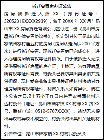 房屋被拆遷人潘XX(身份證號(hào):32052319XXXX2939),曾于20XX年XX月與昆山市XX房屋拆遷有限公司簽訂過一份《昆山市房屋拆遷補(bǔ)償安置協(xié)議書》,約定對(duì)其位于昆山市陸家鎮(zhèn)陸家村漁業(yè)村的房屋(房屋認(rèn)定面積200平方米)進(jìn)行拆遷安置。現(xiàn)拆遷安置房已完成交付,進(jìn)入辦理房屋所有權(quán)等證件階段。由于被拆遷人無法提供原被拆遷房屋的房產(chǎn)證、土地證,為辦理房屋所有權(quán)等證件需要,村委會(huì)已要求其出具承諾并提供擔(dān)保,現(xiàn)村委會(huì)準(zhǔn)備出具相關(guān)證明材料協(xié)助其辦理房屋所有權(quán)等證件,利害關(guān)系人如有異議,請(qǐng)?jiān)诒竟嬷掌鹗鍌(gè)工作日內(nèi)將異議書面材料送達(dá)村委會(huì)(地址:昆山市陸家鎮(zhèn)XX村陳XX路XX號(hào),聯(lián)系電話:0512-5767XXXX),逾期無人提出異議或異議不成立的,村委會(huì)將出具相關(guān)證明材料。