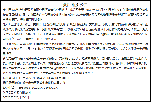 受中國XX資產(chǎn)管理股份有限公司河南省分公司委托,我公司定于20XX年XX月XX日上午9時(shí)在鄭州市緯五路政七街交叉口供銷大廈10樓西會(huì)議室公開拍賣委托人持有的對(duì)XX新能源有限公司和洛陽通豫新奧煤層氣輸配有限公司2戶債權(quán)資產(chǎn),債權(quán)資產(chǎn)明細(xì)如下: