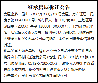 利害關(guān)系人如有異議,請?jiān)诒竟嬷掌鹗鍌(gè)工作日內(nèi)將異議書面材料送達(dá)我公司(地址:昆山市XX鎮(zhèn)XX路XX號,聯(lián)系電話:0512-5728XXXX),逾期無人提出異議或異議不成立的,我公司將與上述繼承人簽訂拆遷協(xié)議。