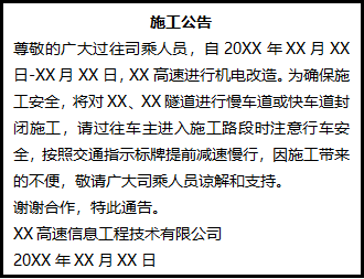 尊敬的廣大過往司乘人員,自20XX年XX月XX日-XX月XX日,XX高速進(jìn)行機(jī)電改造。為確保施工安全,將對XX、XX隧道進(jìn)行慢車道或快車道封閉施工,請過往車主進(jìn)入施工路段時注意行車安全,按照交通指示標(biāo)牌提前減速慢行,因施工帶來的不便,敬請廣大司乘人員諒解和支持。