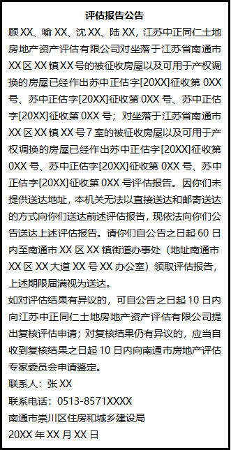 如對評估結(jié)果有異議的,可自公告之日起10日內(nèi)向江蘇中正同仁土地房地產(chǎn)資產(chǎn)評估有限公司提出復(fù)核評估申請;對復(fù)核結(jié)果仍有異議的,應(yīng)當(dāng)自收到復(fù)核結(jié)果之日起10日內(nèi)向南通市房地產(chǎn)評估專家委員會申請鑒定。