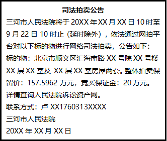 三河市人民法院將于20XX年XX月XX日10時至9月22日10時止(延時除外),依法通過網(wǎng)拍平臺對以下標(biāo)的物進行網(wǎng)絡(luò)司法拍賣,公告如下: