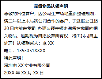 尊敬的各位客戶,因公司生產(chǎn)場地重新整理規(guī)劃,請三年以上未與我公司合作的客戶,于登報之日起30日內(nèi)前來我司 辦理認領(lǐng)并領(lǐng)走滯留在我司的相關(guān)物品,逾期視為自愿放棄所有權(quán),將由我司自主處理!認領(lǐng)聯(lián)系人:李XX