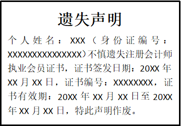 個人姓名:XXX(身份證編號:XXXXXXXXXXXXXXX)不慎遺失注冊會計師執(zhí)業(yè)會員證書,證書簽發(fā)日期:20XX年XX月XX日,證書編號:XXXXXXXX,證書有效期:20XX年XX月XX日至20XX年XX月XX日,特此聲明作廢。