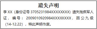 李XX(身份證號(hào)3705231984XXXXXXXX)遺失殘疾軍人證,編號(hào):2009010920984XXXXXXXX,因公九級(jí)(14-12.22),特此聲明作廢。