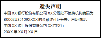 中國XX銀行股份有限公司XX分理處不慎將機構(gòu)編碼為B0002U35109XXXX的金融許可證丟失,聲明作廢。