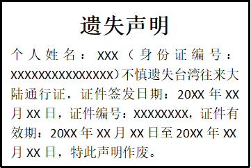 個人姓名:XXX(身份證編號:XXXXXXXXXXXXXXX)不慎遺失臺灣往來大陸通行證,證件簽發(fā)日期:20XX年XX月XX日,證件編號:XXXXXXXX,證件有效期:20XX年XX月XX日至20XX年XX月XX日,特此聲明作廢。